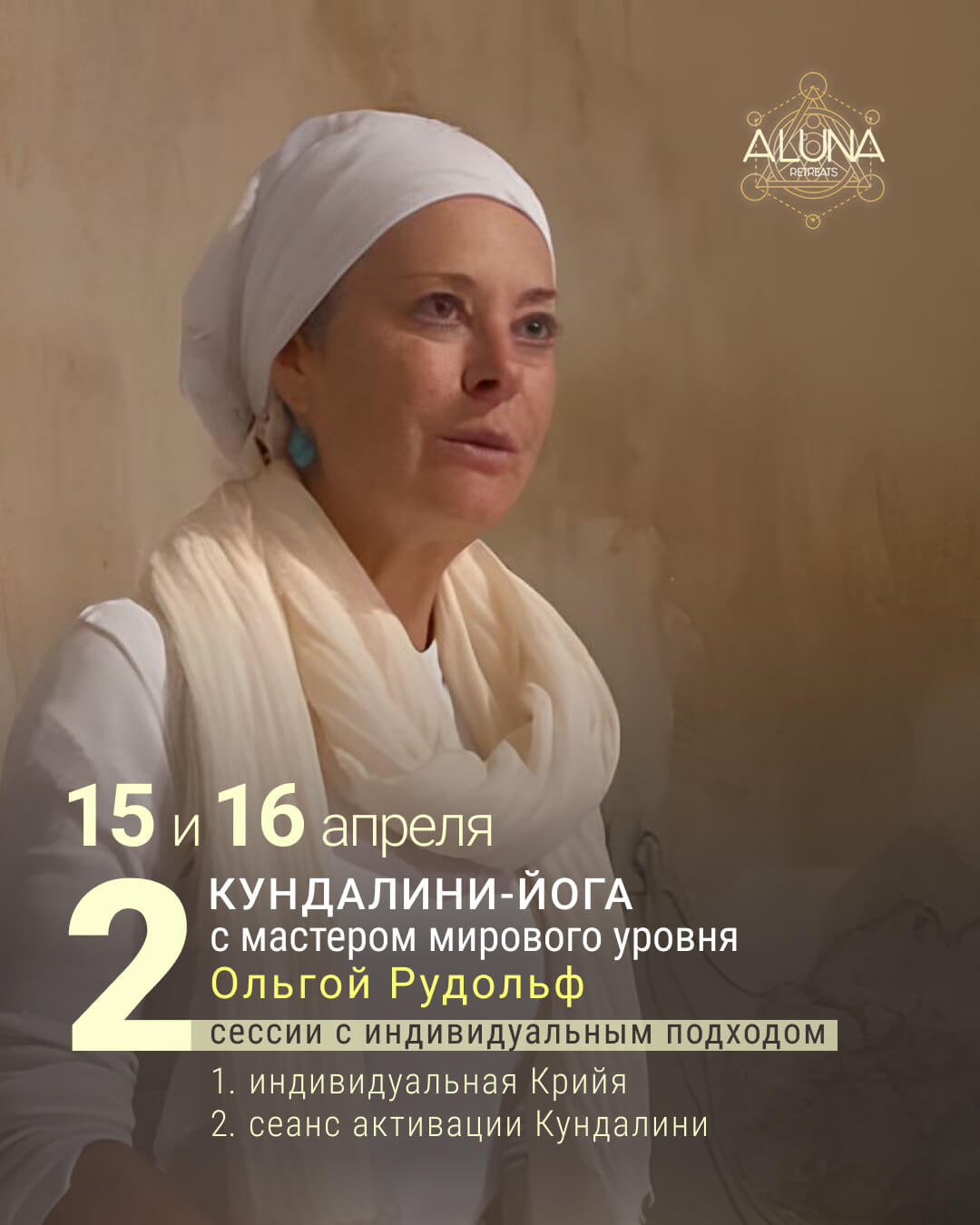 15 и 16 апреля приглашаем вас на сессии Кундалини-йоги, которые будут интересны не только практикующим, но и мастерам этого направления. Нас ждет встреча с уникальным мастером мирового уровня – Ольгой Рудольф.